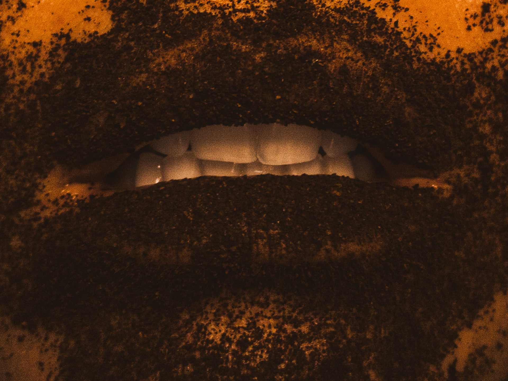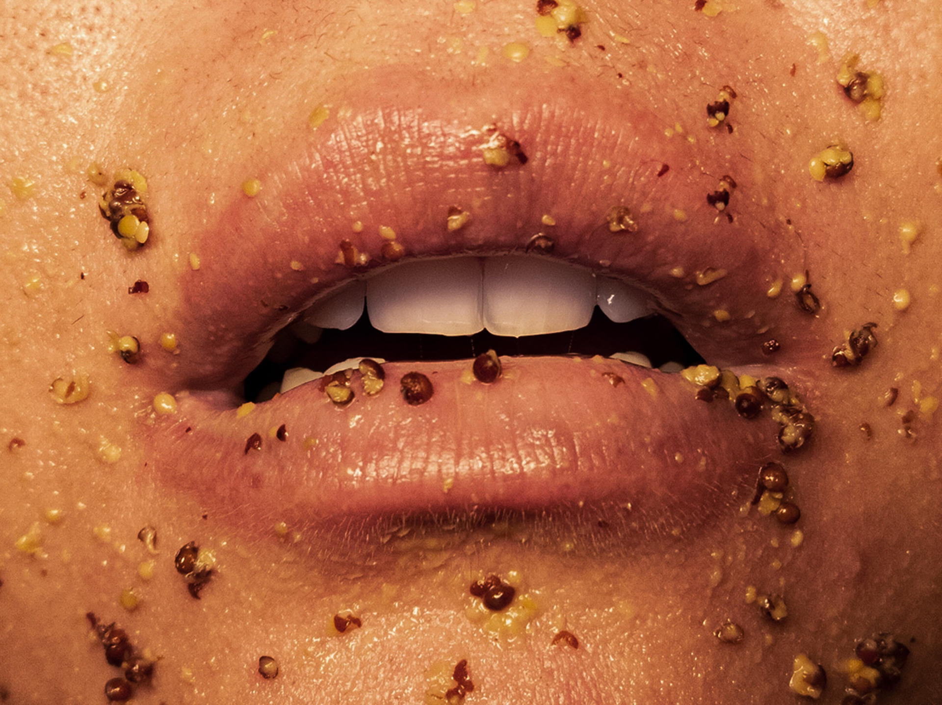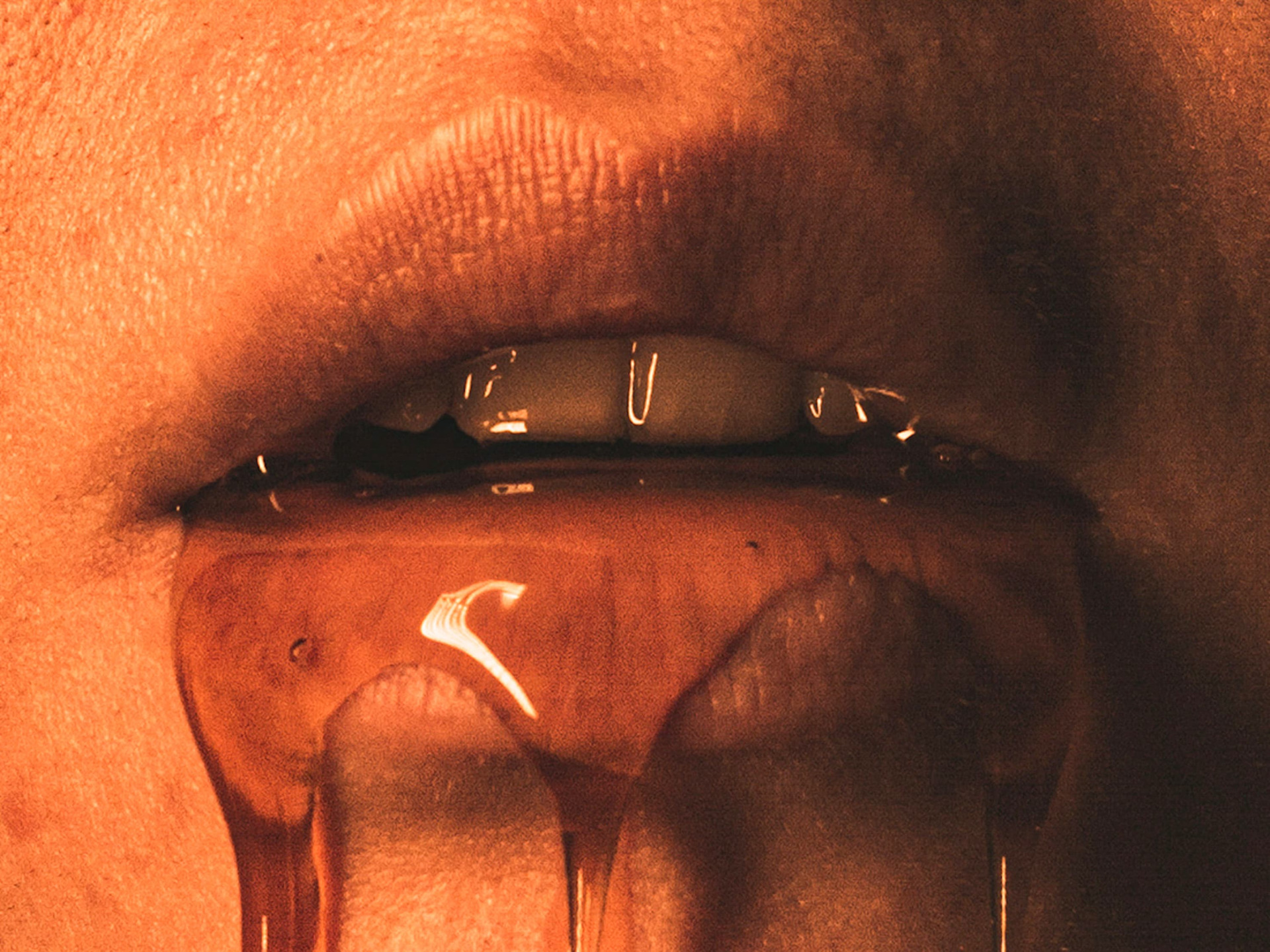 As imagens operam em um regime de proximidade extrema, onde língua, saliva, pele e substâncias se confundem, produzindo uma sensação ambígua de intimidade e desconforto. Nesse território reduzido, o gesto é mínimo e o som é quase ausente: o que resta é o sussurro, entendido não como fala, mas como presença contida, desejo interrompido e comunicação em suspensão.